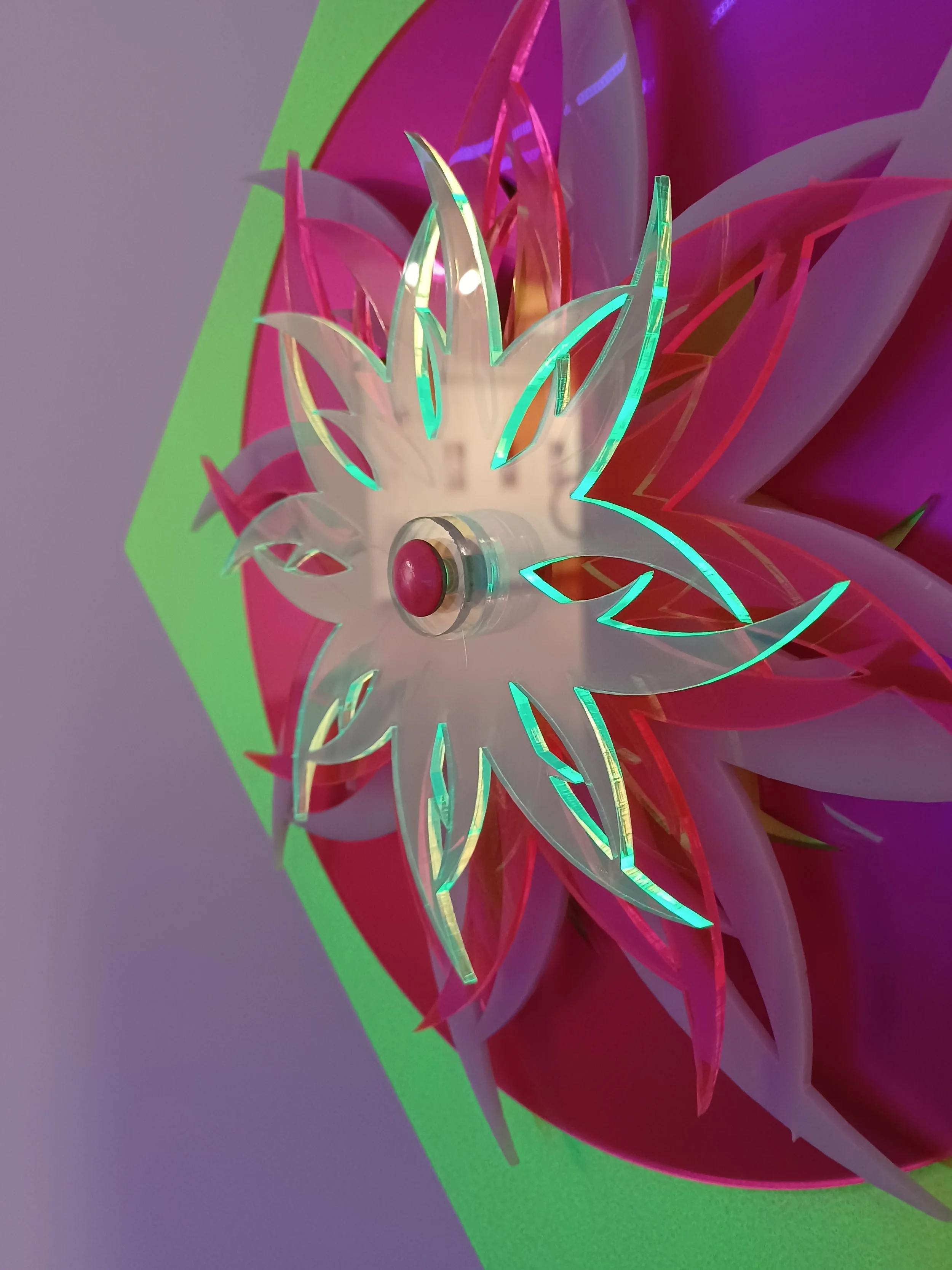 Ernie’s optically illusive paintings replicate states of chaos, fleeting thoughts, movement, and connection. Her sculptures use light, colour, and circular forms to create an interactive site. These works are assembled to allow for spinning, facilitating a hypnotizing movement through the use of bolts, gears, and bearings. Created with highly organized methods, the work is intended to offer a safe space that is controlled but also chaotic. Asserting a disruption in the everyday by pulling the viewers into a hypnotized state; an intrigue of the senses.