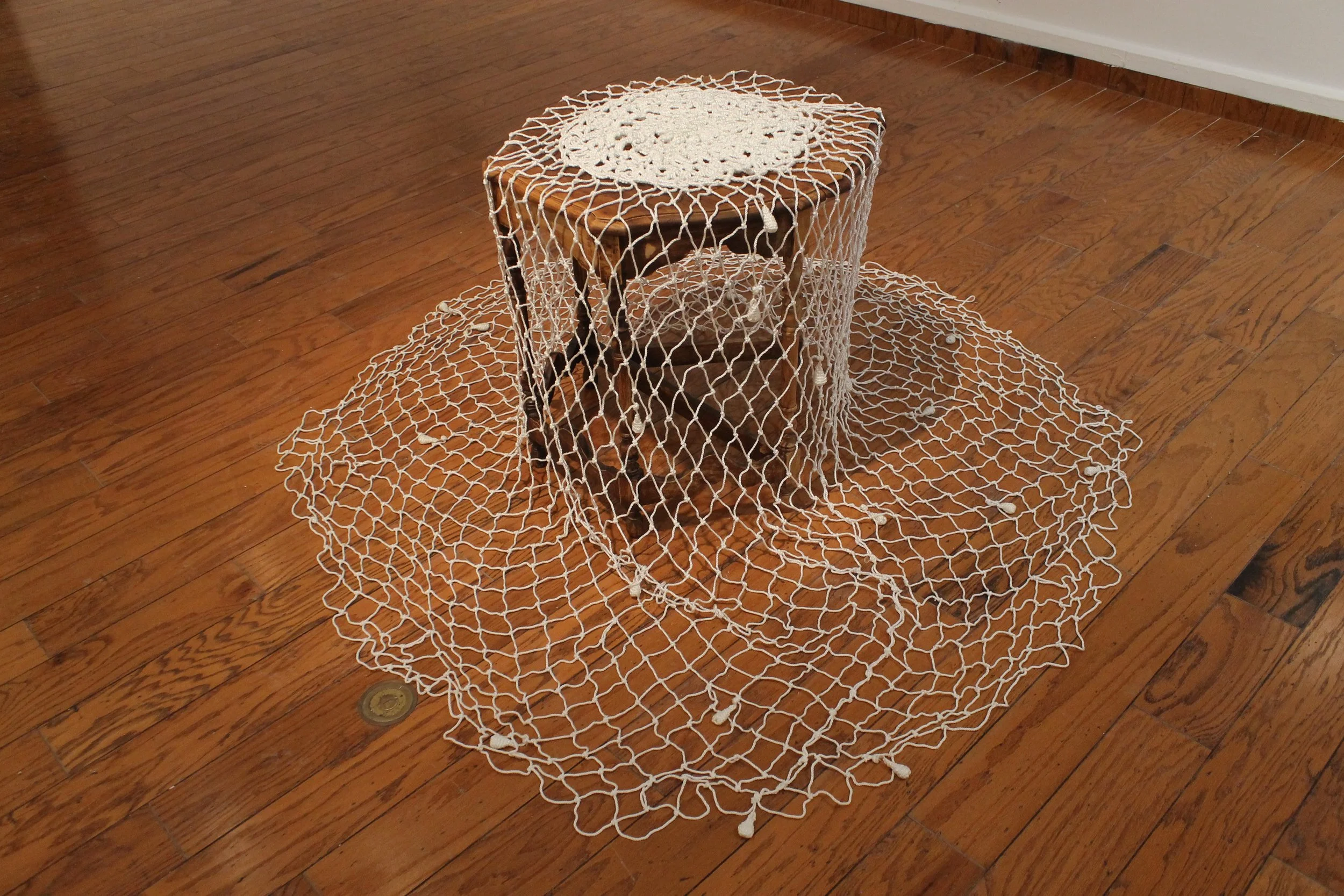A variety of media and creative strategies ranging from tradition forms, such as embroidery and photography, to digital collage and reclaimed materials, explore histories of place, displaced and disappearing communities, and alternative
